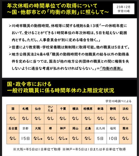 長らく間が空いてしまいました。 業務繁忙期でしたもので、ご容赦ください。 その傍らでも、労働条件改善を目指す歩みは止めていません。 私の所属する学労川崎は去る5月1日メーデーの日、川崎市職員の休暇制度改善に目指す取り組みにおいて、新たな段階に踏…