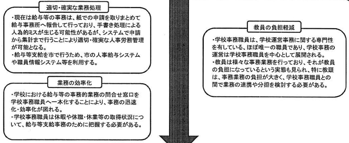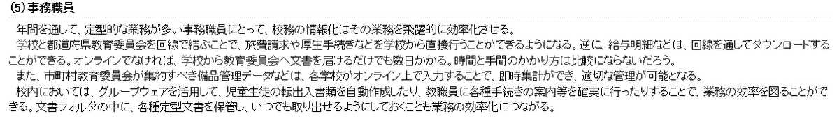 ……とにかく要するに「学校事務職員はもっと働け」という方向性を推進するうえで障壁となる「いや、今の仕事どうすんだよ」という課題に対して、「庶務事務システム入れれば問題ないでしょ」という材料に用いられていることだ。