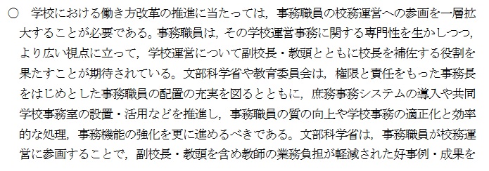 厄介なのが、学校事務職員の職の確立だの地位向上だの能力活用だの教師が子どもと向き合う時間の確保だの教頭・教師の負担軽減だの子供の豊かな学びを支援するだのつかさどるだの学校運営に参画するだの……