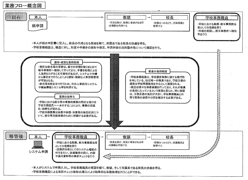 給与(服務を含む)・旅費・人事といった総務・庶務事務をめぐり、県費当時=電子化以前は、管理職が決裁したものを「結果」(給与・旅費支給や管理帳簿)に反映させるのが事務職員の仕事であった。